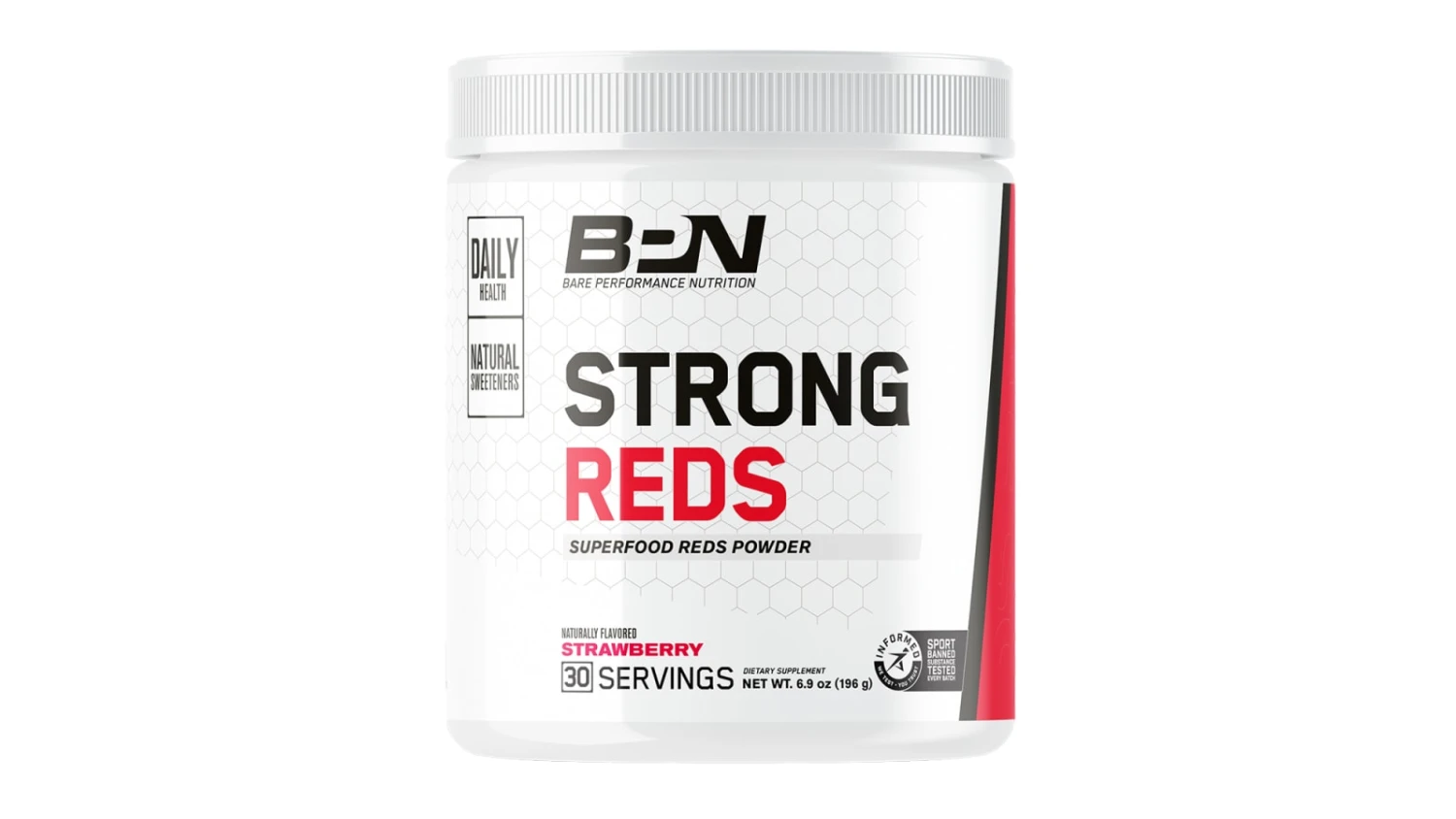 BPN’s strawberry-flavored “Strong Reds” is full of fruit extracts, antioxidants, and digestive enzymes to help support the immune system, improve natural energy, and increase nutrient absorption.