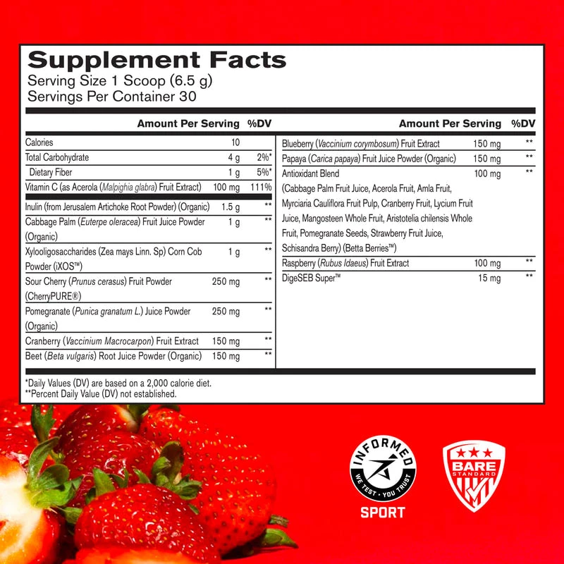 The Strong Reds formula is naturally sweetened with stevia glycoside (Reb M) and stevia leaf extract (Reb A) and doesn’t contain any artificial flavors or sweeteners. The formula works as a nutrient-rich powerhouse for gut health and boosting cellular optimization.