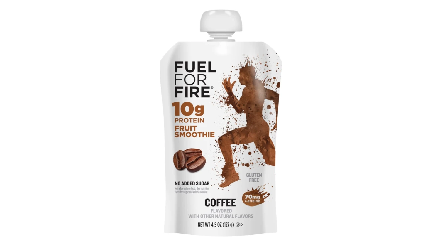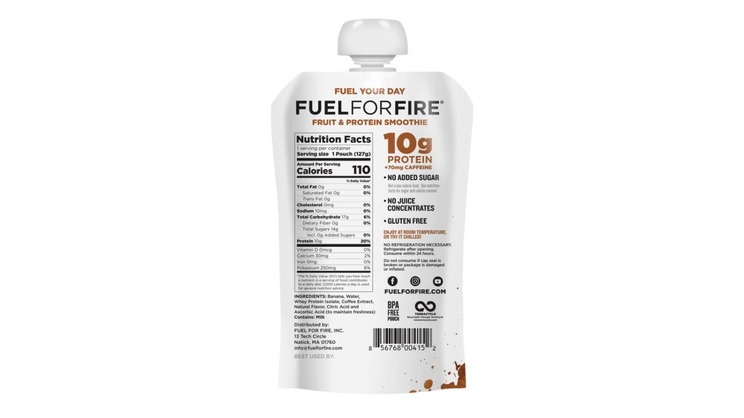 A portable protein snack that tastes like a smoothie. Fuel For Fireβs new Coffee flavor raises the bar again for what an energy drink can deliver, combining real pureed bananas, whey protein, caffeine, and coffee extract into a delicious, gluten-free mix that provides energy for your workout. Each 4.5 ounce fuel pack contains a whopping 10 grams of protein with no added sugar and just 110 calories.