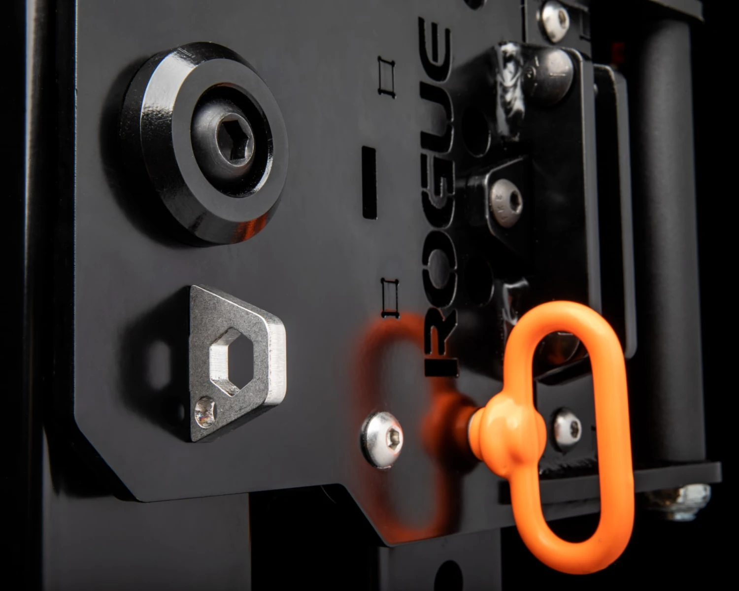 Compatible with any Rogue Monster Series rig or rack (a Monster Lite version version is sold separately), the LT-1 50 CAL Trolley and Lever Arm Kit gives athletes the ability to quickly reconfigure a unit for a wide range of different movements, without the need of a wrench or other tools. We’ve put years of research and refinement into this product, looking to create an optimal mechanism that can attach to an existing 3×3” upright and enable easy north/south adjustments with lock-in stability. Version 2.0 improves upon the original design with a new look and several key upgrades, including numbered uprights, a more robust tensioning system, and easier installation. We’ve also added a secondary locking trigger for improved safety, and a key for locking the lever arms in the “down” position—turning them into functional uprights.