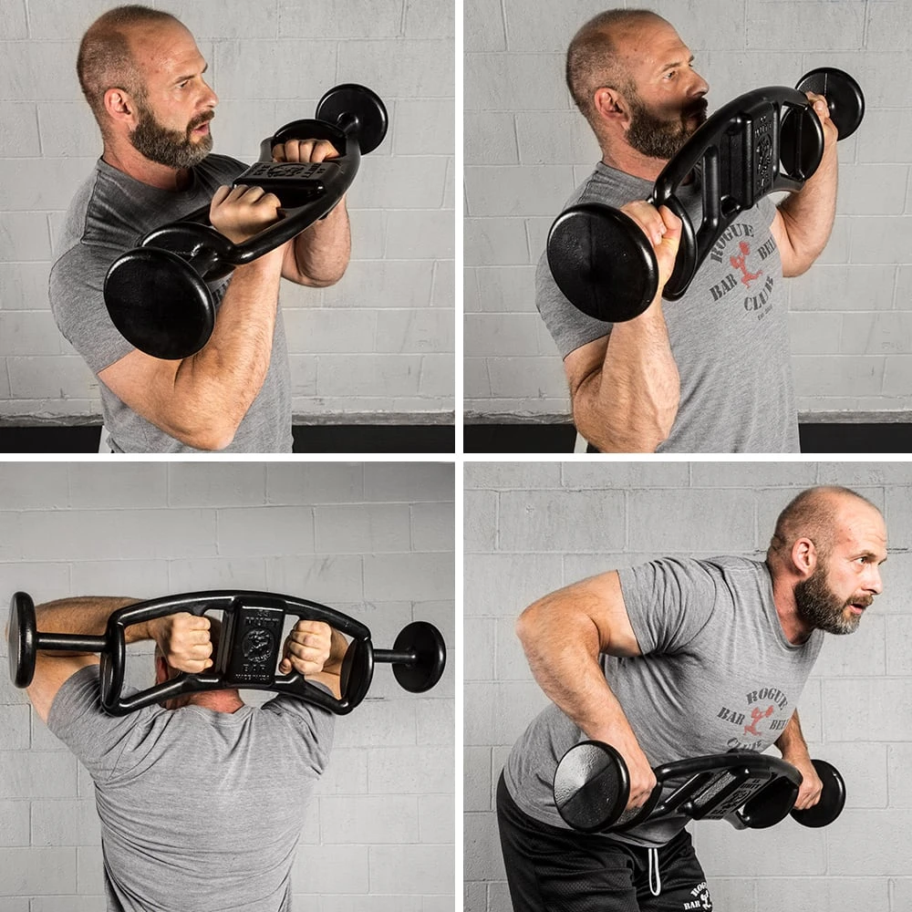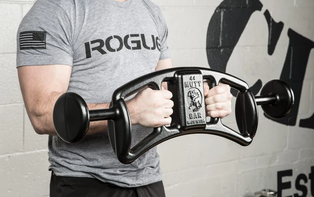 The Mutt Bar is exactly what its name would suggest—a new mixed breed of exercise bar, bringing together elements of the traditional Olympic barbell, curl bar, Swiss bar, dumbbells, and more; all in a single cast iron unit. Mutts are produced in five unique weight increments (22LB, 33LB, 44LB, 55LB, 66LB) and can be ordered individually or as part of a full five-bar set with a custom bolt-together Mutt storage rack.