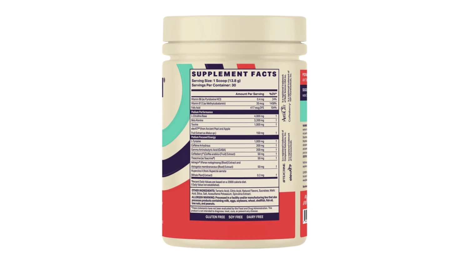 Podium Fuse® Pre-Workout supplement is designed to get you through even the most difficult programming. Fuse® combines a FOCUSED ENERGY portfolio of premium ingredients to deliver smooth energy with mental clarity, focus, and locked-in performance. This includes 4000mg of L-Citruline (for improved blood flow), 3200mg of Beta Alanine (for buffering acid build-up in the muscles), 200mg of caffeine, and 150mg of elevATP® (for promoting increased power output and training volume).