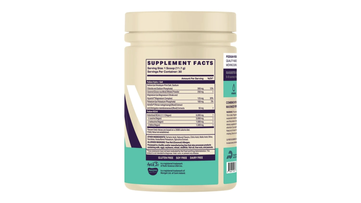 PODIUM HYDRO + SALT® is a gluten free, soy free, dairy free, vegan-friendly supplement that can be effective for pre, intra, or post-workout use. Providing 400mg of electrolytes and critical hydration with Aquamin® and Coconut [Water] Powder, this highly specialized formula also includes 6,000 mg of instantized vegan fermented BCAA’s + AstraGin®–helping your body to more effectively absorb the good stuff and recover faster.