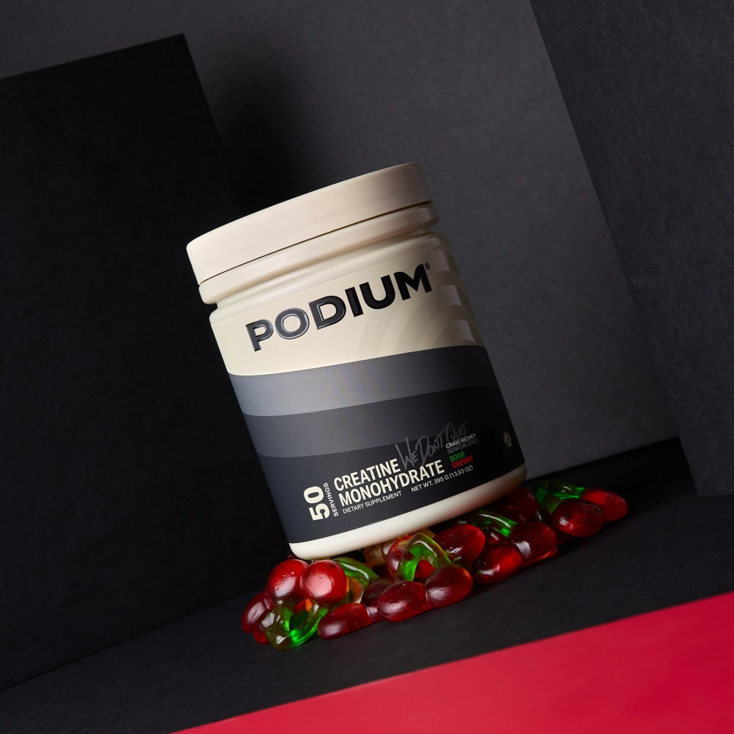 The Sour Cherry variation of Podium’s Creatine Monohydrate supplement was co-developed with accomplished athlete and vlogger Craig Richey, inspired by one of his favorite gummy candy flavors.