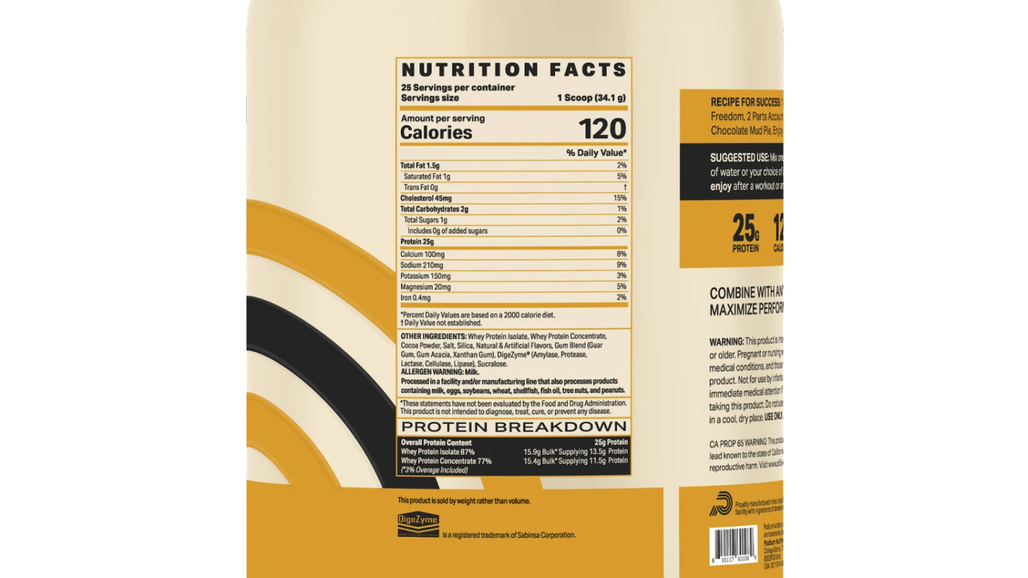 Packed with 25g of protein per serving, this chocolate loverβs dream features an assortment of helpful digestive enzymes and just 120 calories. Mix a scoop with water and get your natural whey infusion without sacrificing on taste.