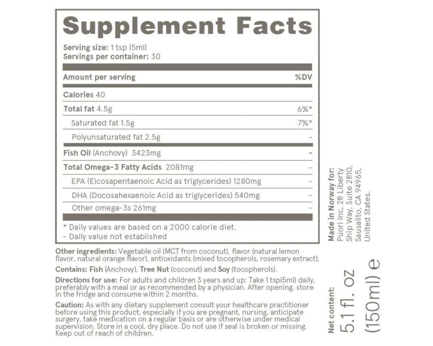 Puori Liquid O3 is an ultra pure fish oil with a fresh taste of citrus. There is no taste of fish here, so go ahead and drink it straight from a spoon, blend it in your favorite smoothie, or even use it to dress salads. Itβs never been easier to enjoy the healthy omega-3s that your body needs.