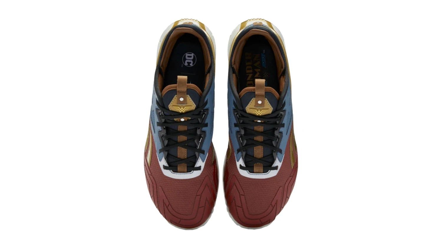 Part of a new line of Reebok Nano X2 training shoes inspired by the superheroes of DC comics, this model instantly evokes the battle armor of WonderWomanâ„¢, with a bold color combo of terra red, brave blue, and matte gold + silver detailing and glowing laces.