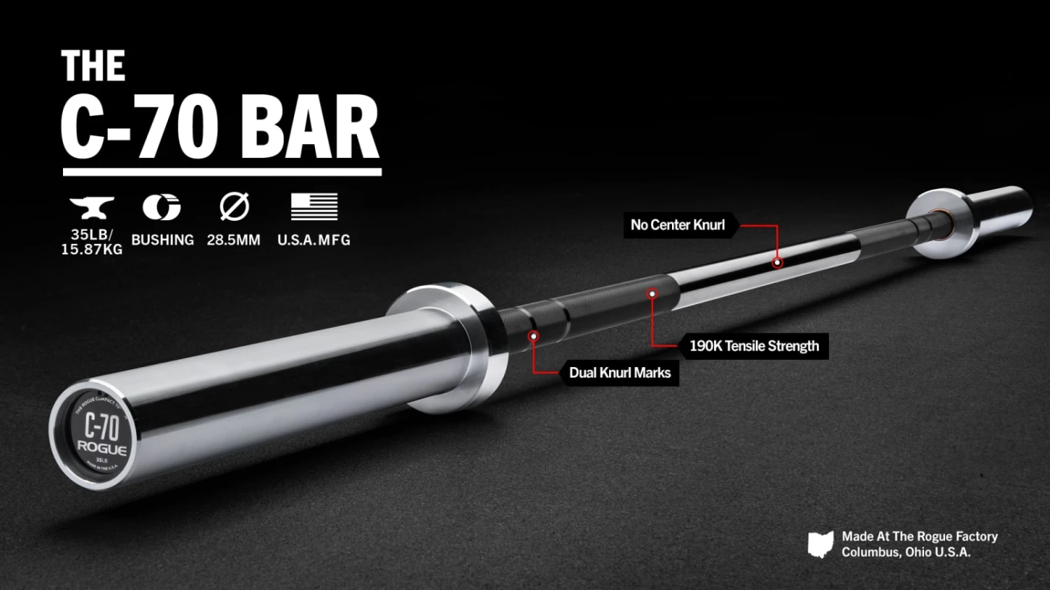 The Rogue C-70 Bar is a shorty 35LB version of the Ohio Bar. Designed for competition use in the CrossFit Games, the barbell’s shorter overall length (69″) allows athletes to be spaced closer together. This can also benefit anyone training in tight quarters, be it a small garage gym, tight basement, or busy training facility. This bar has knurl marks for both Olympic and Powerlifting grips, and the distance between collars is 43″ versus the standard 52″.