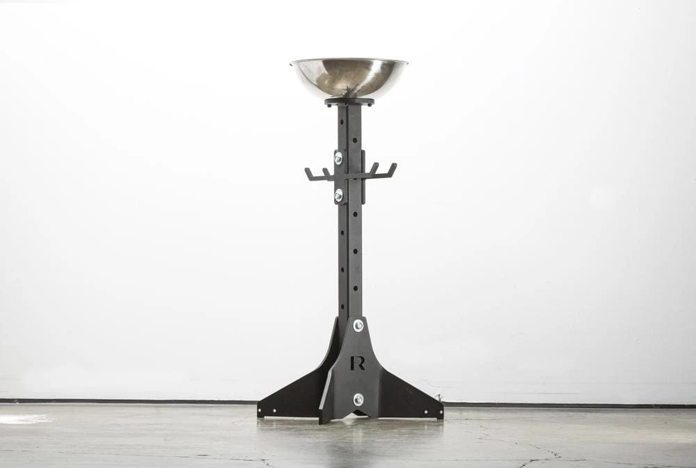 The freestanding version of the Rogue Chalk Stand (a mounted version is also available) is made in the USA using a 2×2″ 11-gauge steel Upright tube and 0.375″ thick base plates for max stability. The 38.5″ tall unit features a quality, stainless steel bowl measuring 13.625″ in diameter with a 5” depth—perfect for storing enough chalk for multiple athletes to easily access.