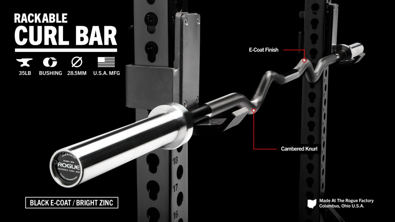 The Rogue Rackable Curl Bar features the same cambered design, knurl pattern, and E-coat finish as our original Rogue Curl Bar, but with 20 inches of additional space between the sleeves (51.8125” vs 31.5”)—making it rackable in most standard power racks.