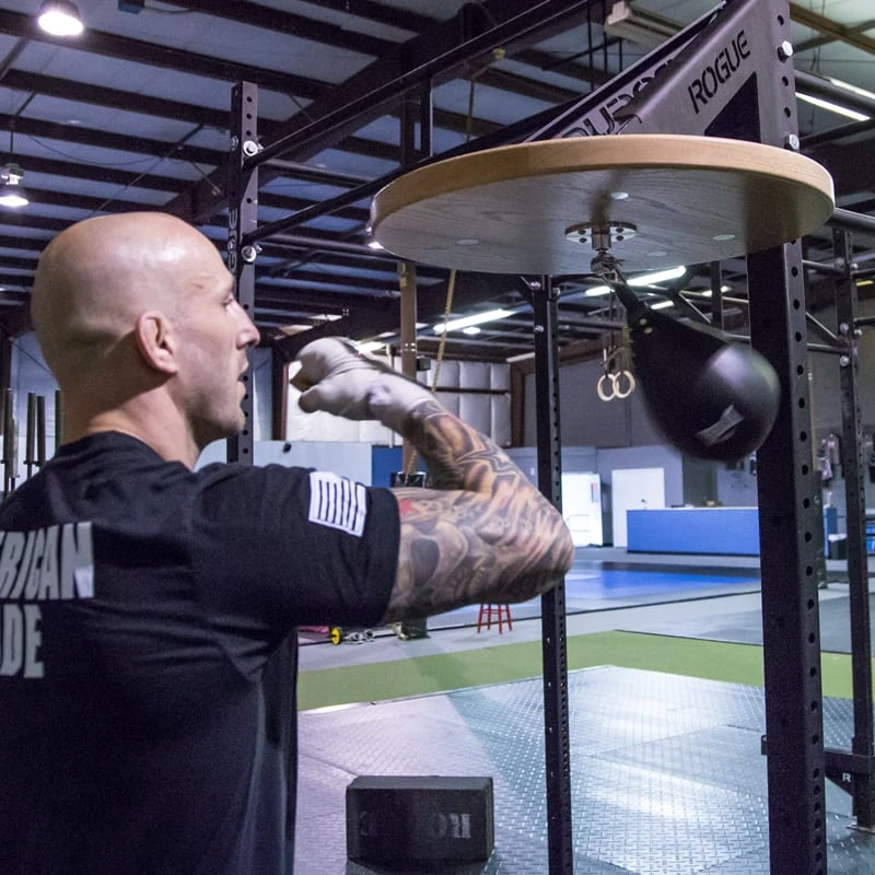 The Rig-Mount Speed Bag Platform was inspired by a request from multi-time boxing world champion Robert “The Ghost” Guerrero, who wanted his speed bag more centralized and accessible in his training space. The attachment includes a set of 0.1875″ thick laser-cut steel brackets (holes 4″ on center), all required mounting hardware, and a 24″ diameter platform in Red Oak.