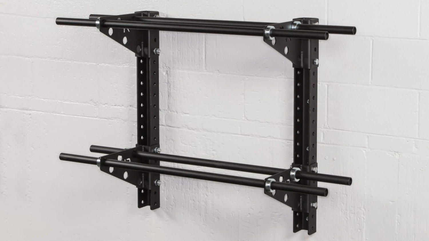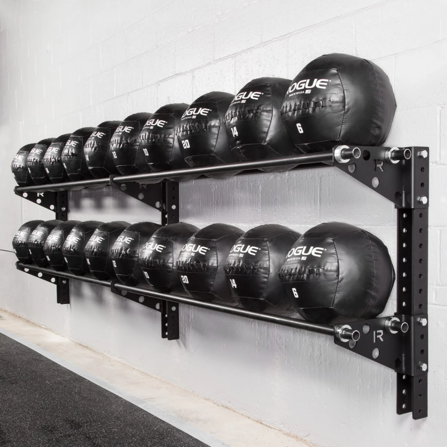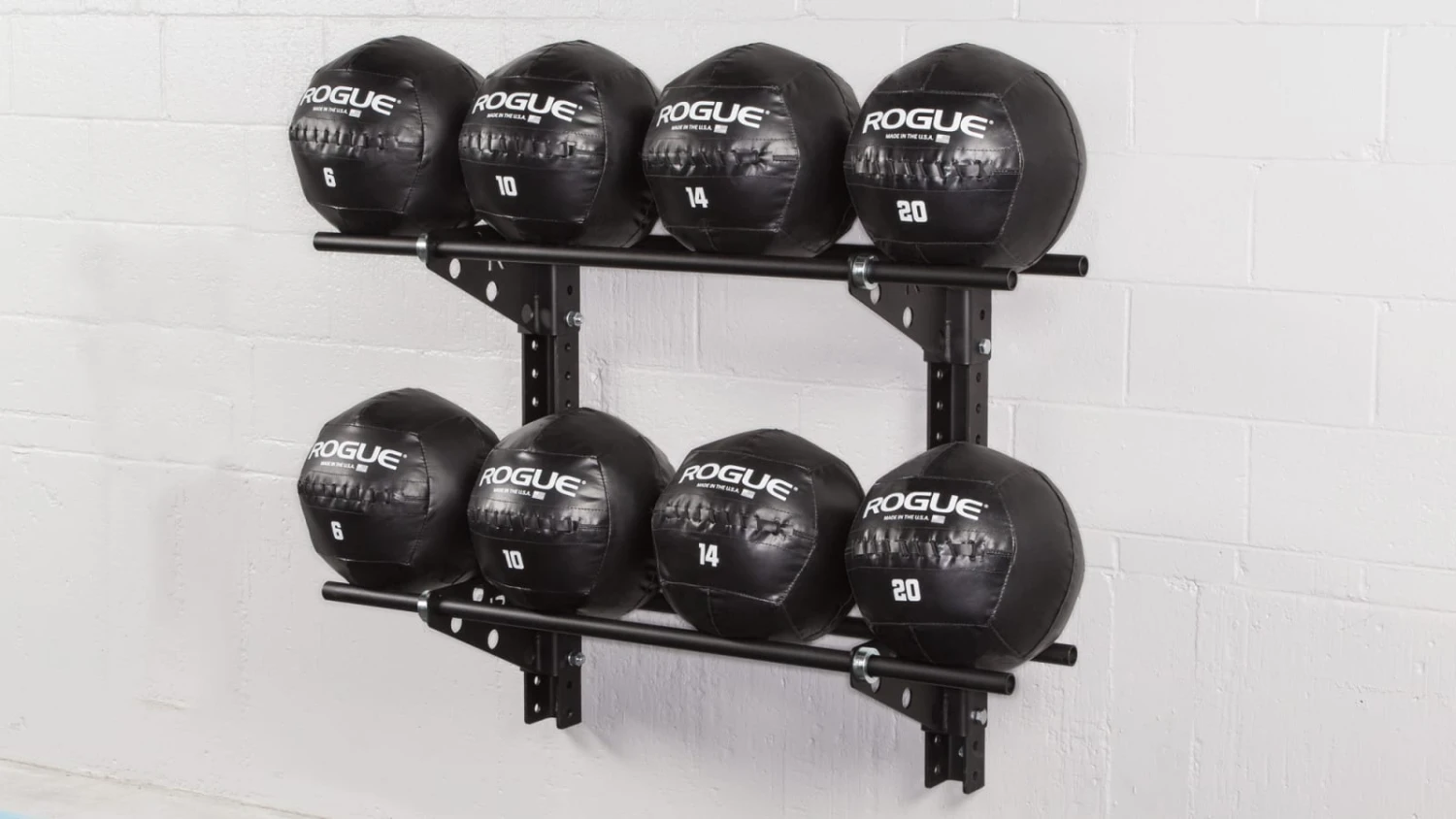 For any gym with more than a few medicine balls and less than enough storage space, Rogue Swiss Brackets are the zero footprint solution. Sold in pairs, these 0.1857″ thick laser cut steel brackets (packaged with a set of four shaft collars) allow gym owners to install a customized, wall-mounted medball storage rack in virtually any size training space.