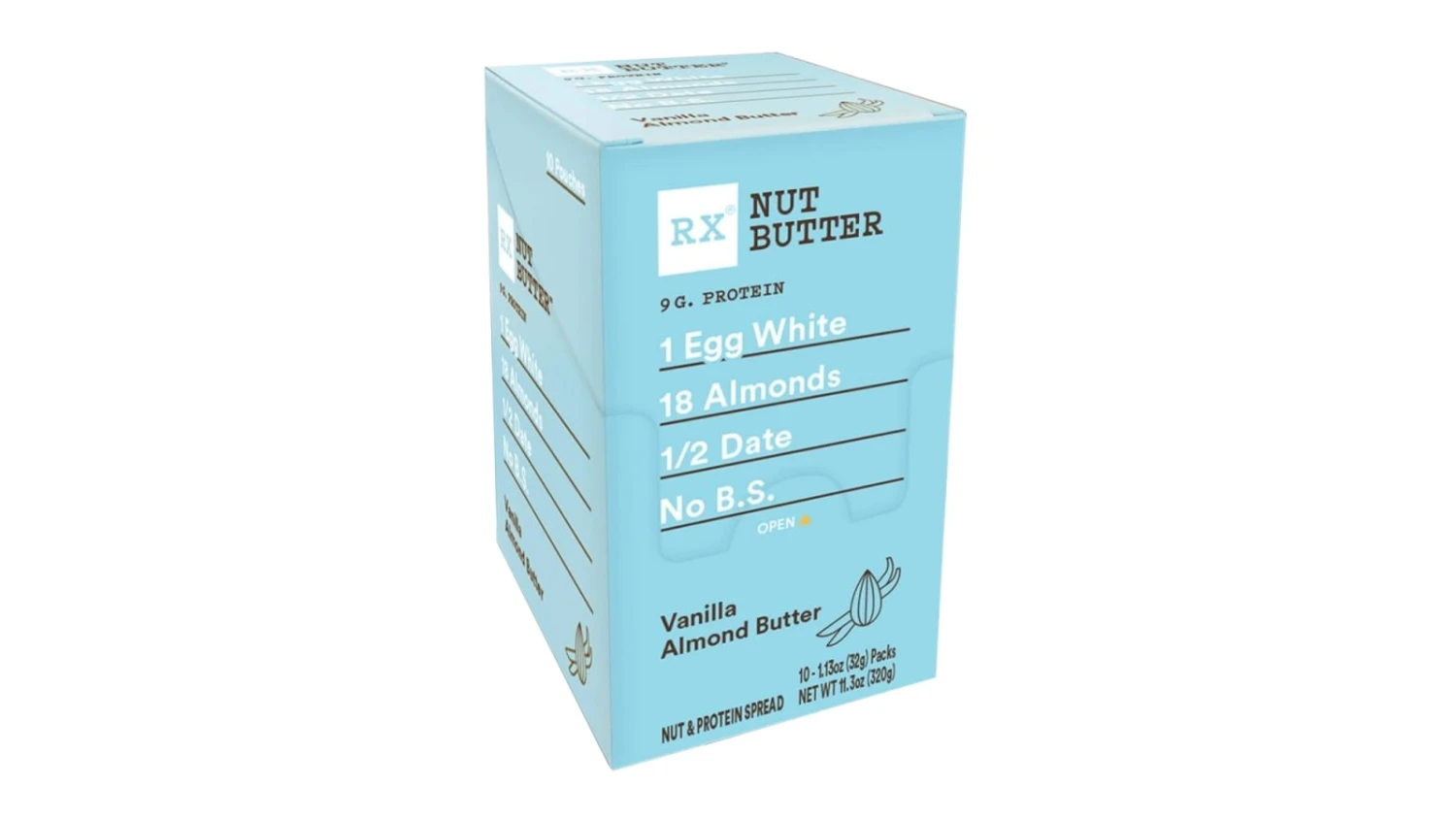 Big in flavor but simple in contents, RXBARβs Vanilla Almond Butter is the perfect on-the-go protein spread. Each serving contains 9 grams of protein + 2 grams of fiber, and the key ingredients are listed right on the front of the package in bold print: 1 Egg White, 18 Almonds, half a Date, No B.S.
