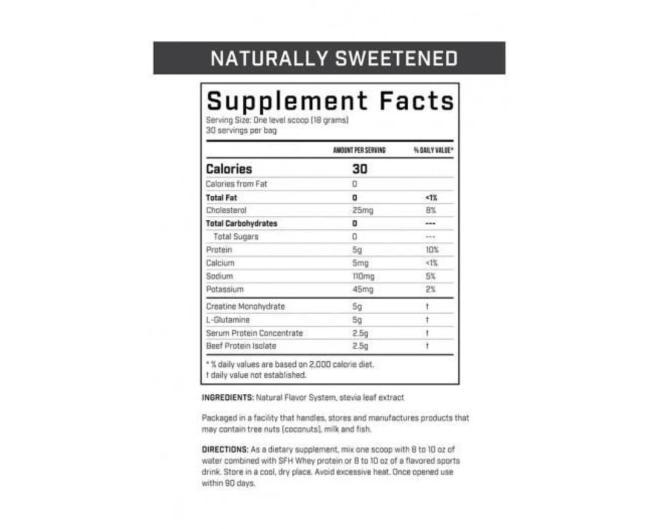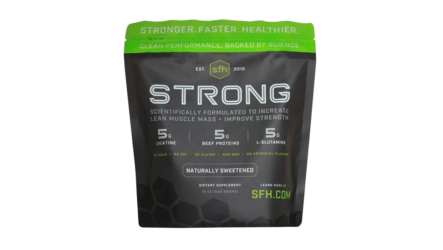 Scientifically formulated to help athletes increase their lean muscle mass and overall strength over time, the new SFH STRONG is a post-workout supplement that can be mixed with a sports drink or another SFH Whey protein. Powered by creatine, glutamine, and SFH beef isolate protein, this dynamic supplement is made in the USA and contains just 30 calories per serving.