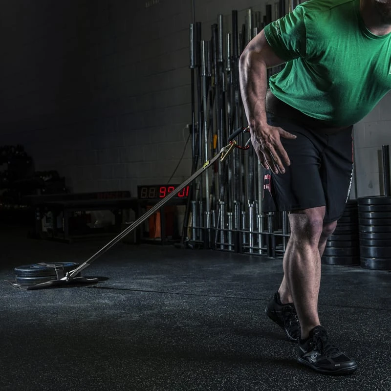 Stop using cables and chains that get frayed and have sharp edges to cut you with, and start using the Spud Inc sled strap. One end is fitted with a large shackle that will fit most any sled and the other end has a 4″ wide delta ring that will slide over a standard power belt. The sled strap is great for using with our lower body and upper body sled straps.